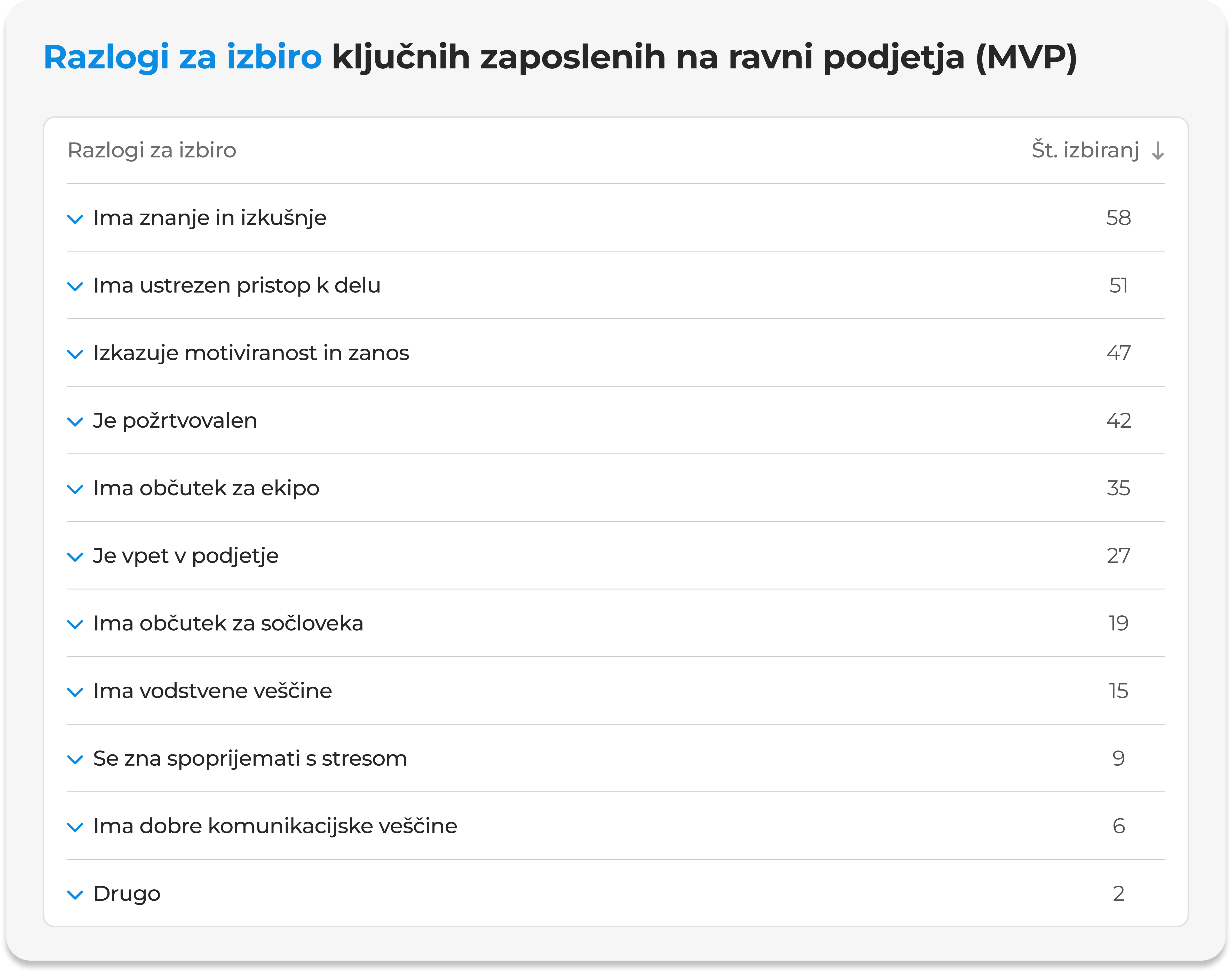Zanimivo je, da med razlogi redko prevladuje zgolj individualni rezultat. Veliko večjo težo imajo zanesljivost, sodelovanje in prispevek k skupnemu uspehu. To potrjuje, da pomembnost posameznika ni le v osebni učinkovitosti, temveč tudi njegovemu vplivu na širše delovanje organizacije.